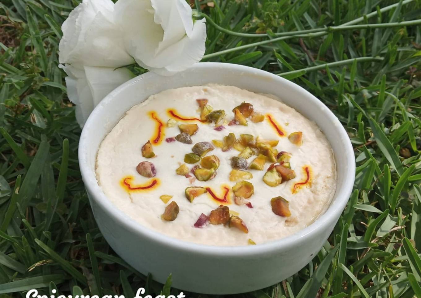 - To the mixture add soaked raisins, rose water and chopped pistachios. Pour the mixture in equal proportions in a ramekin/ silicone mold (whatever available). Add the kesar and pistachios to garnish.