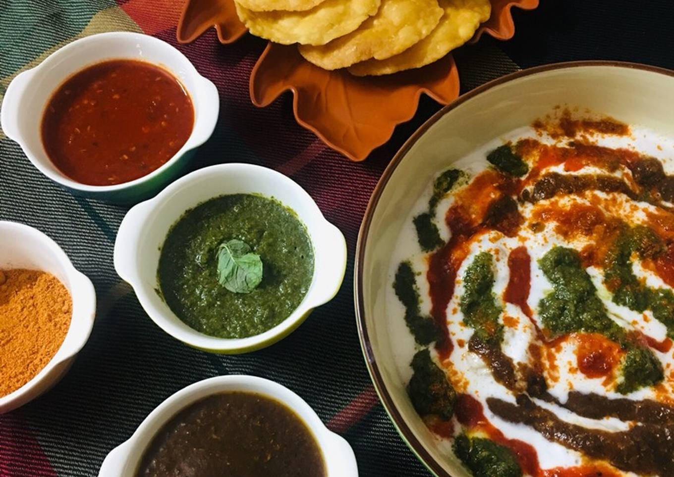 - Now start assembling put the badas in a big bowl add yougurt add all the three Chutney ‘s n sprinkle some chaat masala.Crumble some papadi over it n enjoy every bit of it