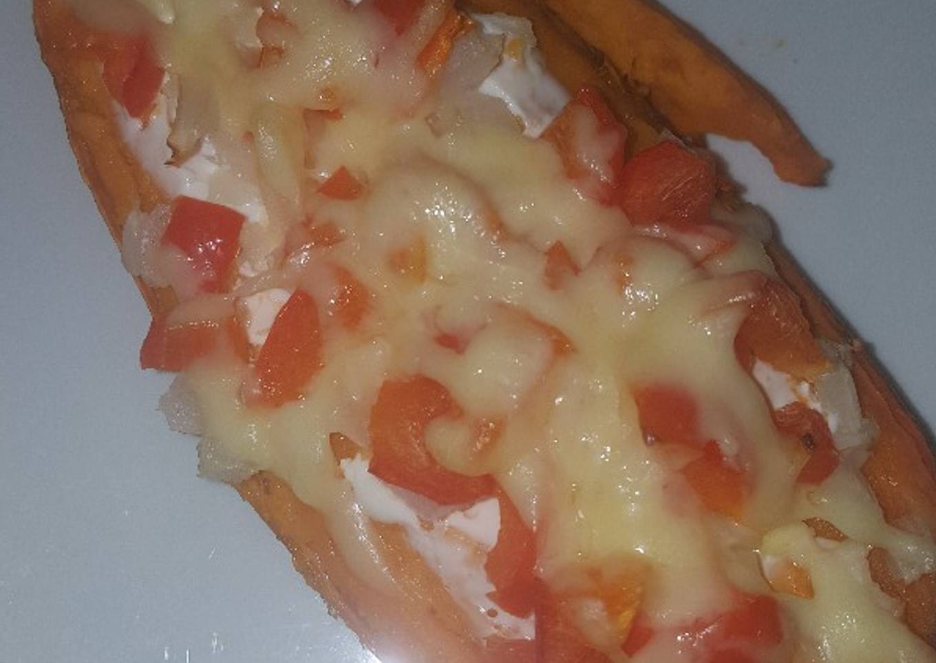 - Remove from the oven cut in half and scoop a little of the centre out with a spoon. Fill with natural yoghurt and cover top of potatoe with the yoghurt. Dice the pepper and onion and sprinkle over the top and then add grated cheese and put back in the oven for 10 minutes.