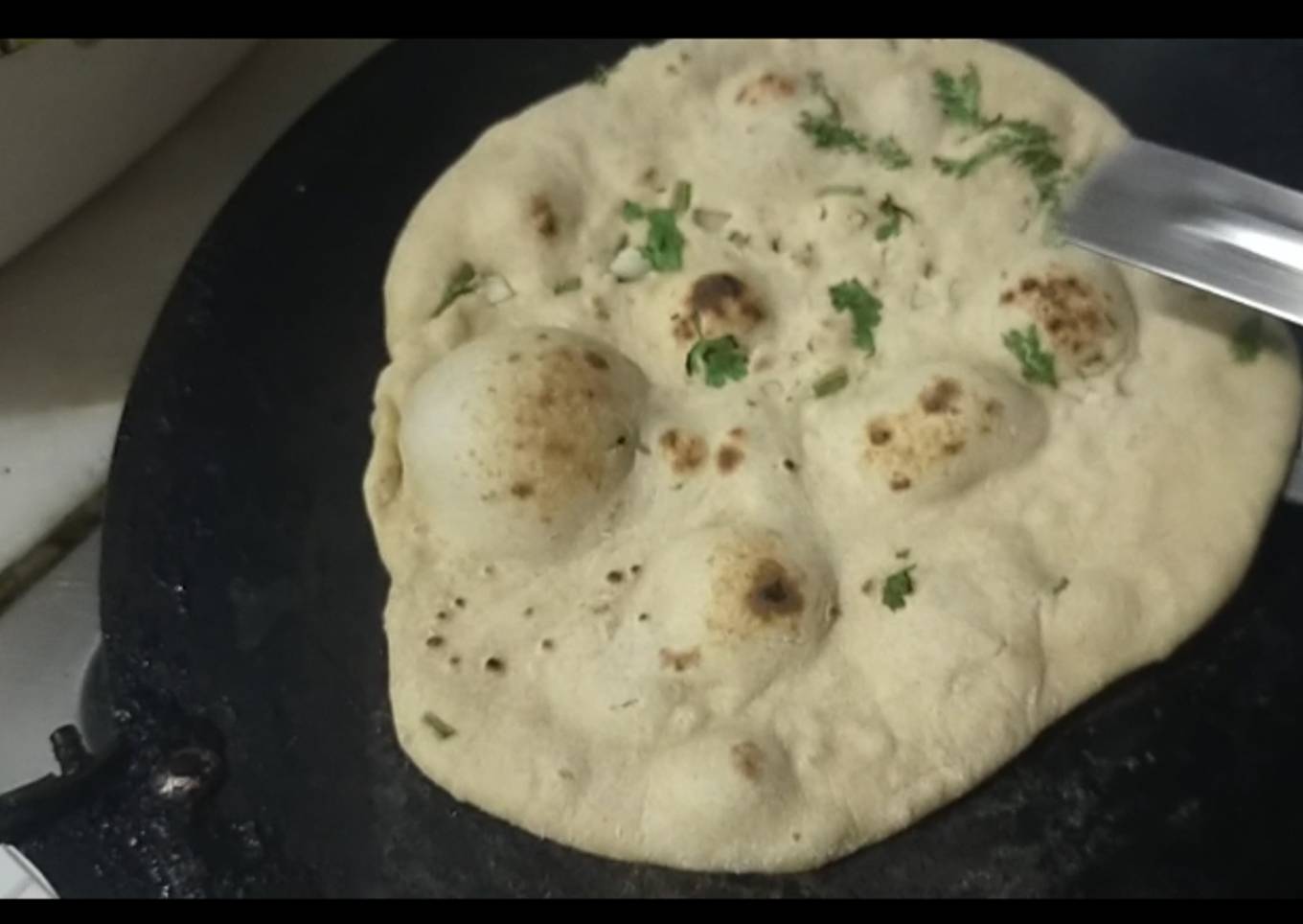 - Grease one side of naan with water and place the water side on the tawa cook it until bubbles appear then flip the tawa and cook until brown spots appear