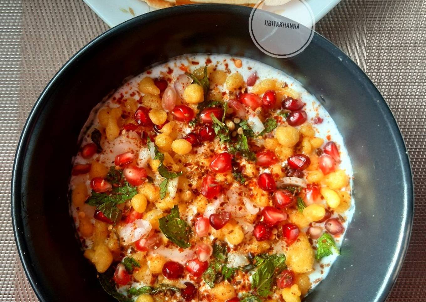 - In a blender take curd, roasted Cummin and coriander powder and salt and blend it. Pour it in a bowl and add in the onion, mint, chilli, boondi as needed and boiled potato cubes if you are adding. Garnish it with more roasted Cummin and coriander powder, chilli flakes, pomegranate and mint. Serve with Papad along with rice and Dal etc. Bon appetit!