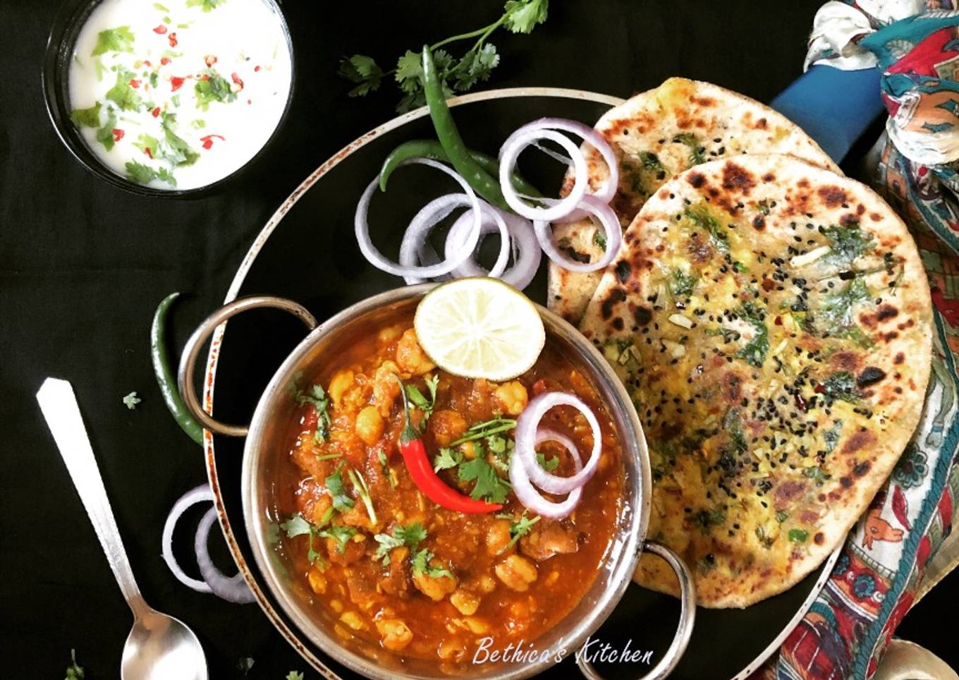 - Serve with the prepared chole, raita, onion rings, green chilies and lemon.