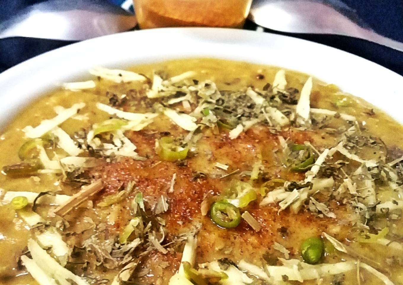 - Pour haleem in a serving bowl, top with chopped coriander leaves, chopped mint leaves, chopped green chilies, ginger juliennes, roasted ground cumin and all spice powder.