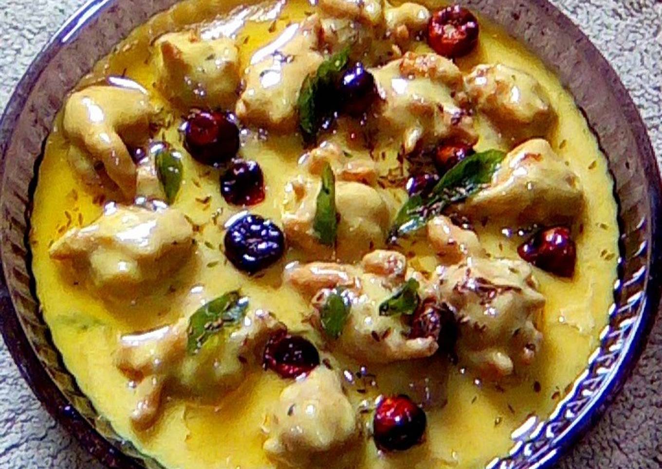 - In pot add oil, curry leaves, cumin seeds, ginger garlic paste and mix well. Add 1/4 cup water and cook for 2 min or so. Now add the gram flour yogurt mixture, and mix well. Bring to a boil, cover and cook on low flame for about 2 hours while stirring in between.