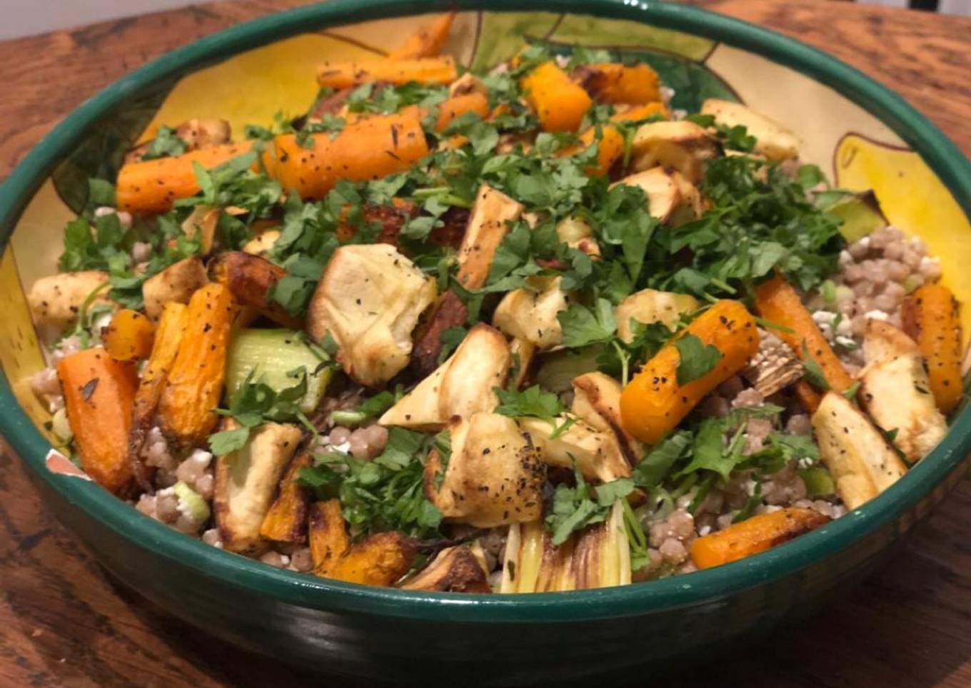 - Once the veg is soft and roasted, discard the garlic and mix the veg into the cous cous.