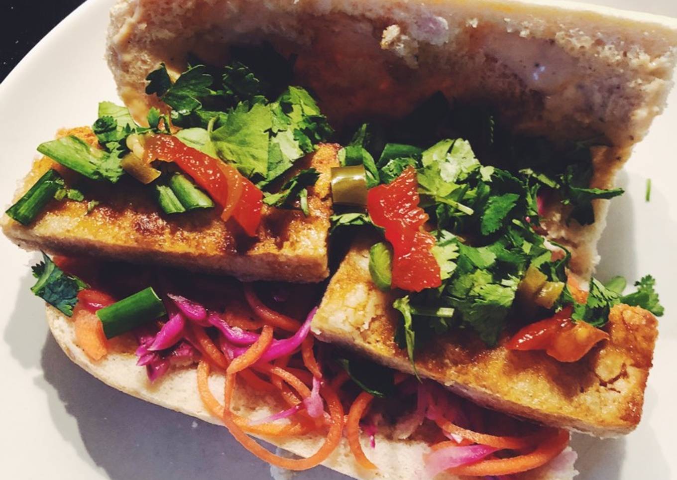- Spread an even amount of the mayo mixture on top of baguette. Place large portion of pickled veggies on bottom half. Place tofu on top of pickled veggies, and sprinkle with the marinade to cover the tofu. Add jalapeños, green onions and coriander to taste!