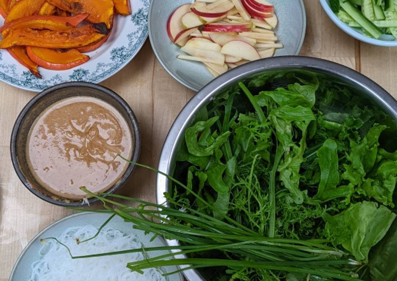 I've gone with the following fillings: vermicelli noodles, roast squash, salad leaves, fresh herbs (mint, coriander, wild garlic, three-cornered leek), carrot, apple, cucumber.
